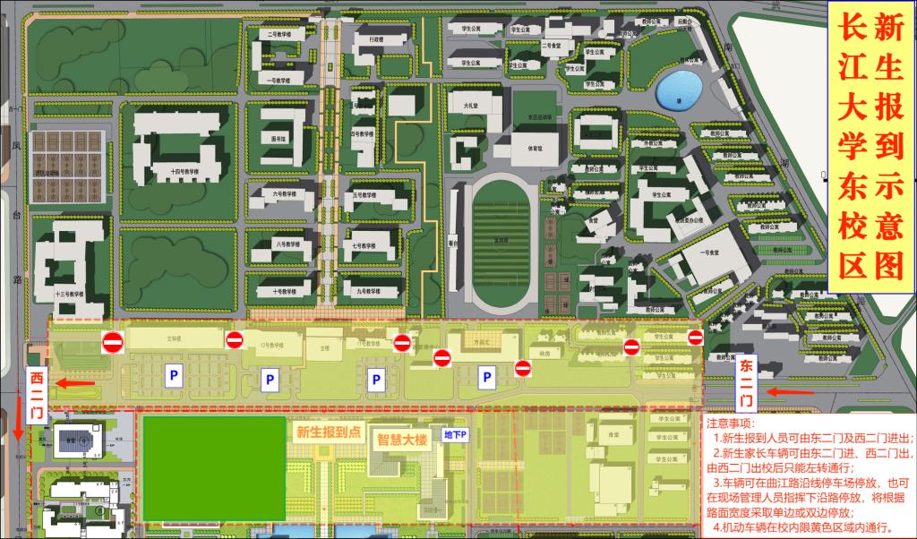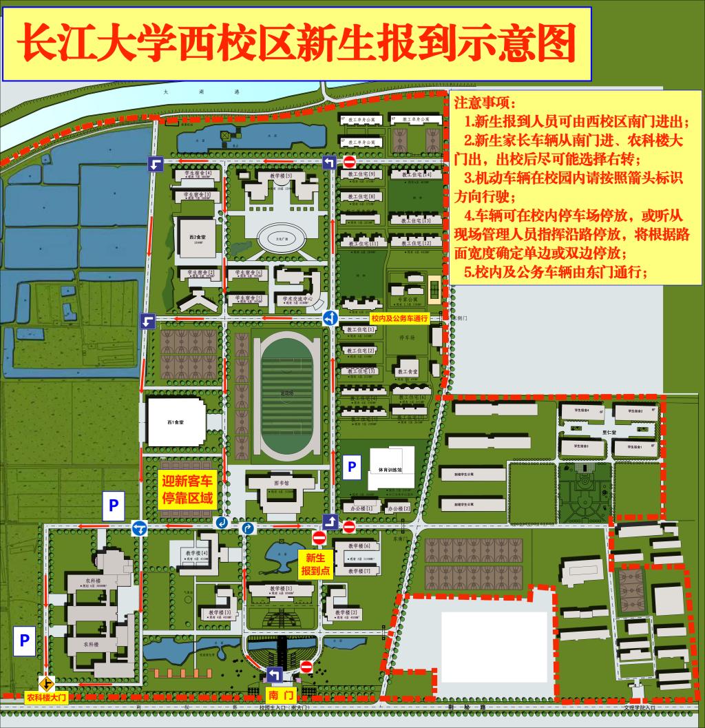 二、西校区6号及7号教学楼周边区域设立迎新报到点,荆秘路为主要通行路段,届时西校区南门及农科楼大门为迎新专用通道,新生家长车辆由南门进校、农科楼大门出校;东门为校内通道,请校内及公务来校车辆尽可能选择东门进校、农科楼大门出校(家属区车辆可选择由东门直接进出)。