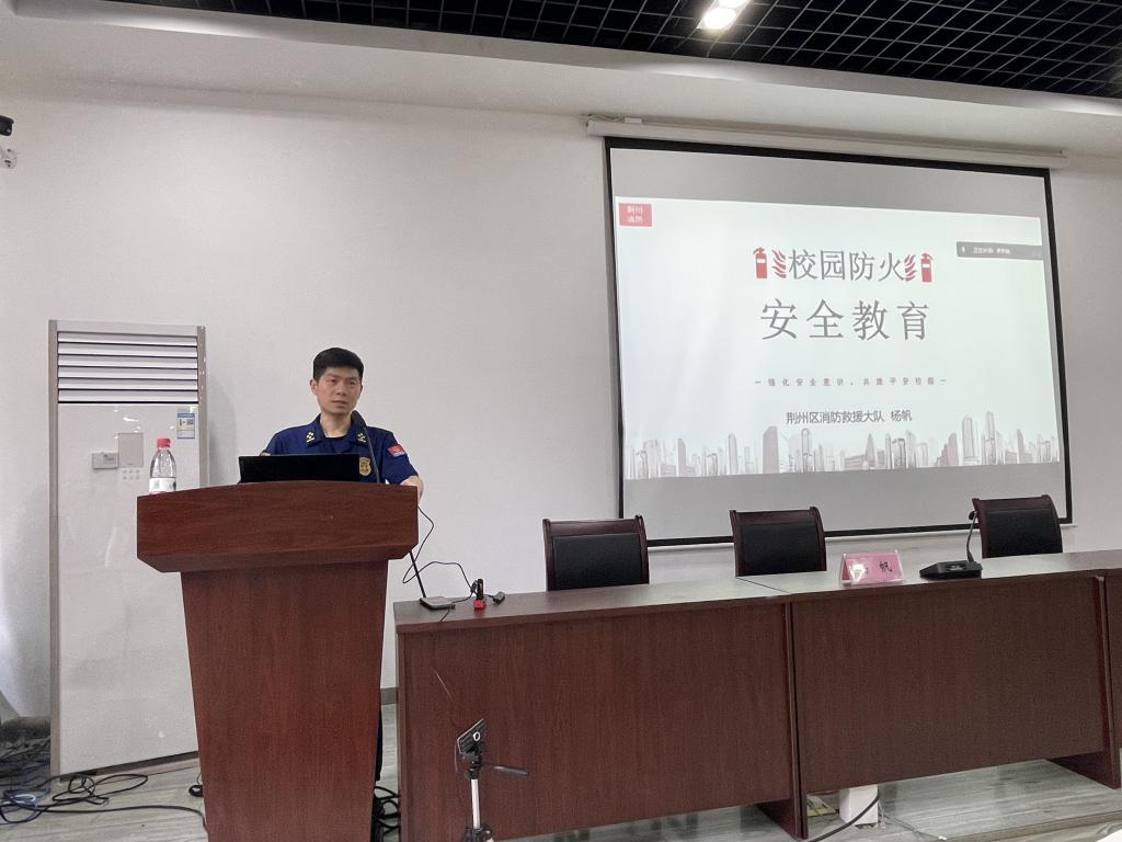 活动特邀请荆州区消防应急救援大队副大队长杨帆做安全指导,于5月11日下午对参加演练的图书馆工作人员进行了消防培训,以讲解消防工作重要性、紧急疏散逃生自救要领等为主要授课内容。5月12日下午组织开展现场疏散演练,保卫处副处长朱行书、邓兴云到现场进行指导,向所有参加演练人员进行了动员。