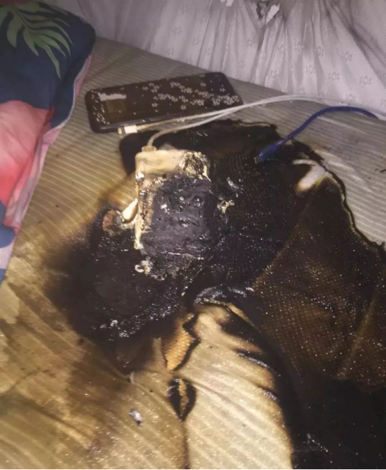 案例三:2019年10月30日,广东佛山一大学生半夜在宿舍床上睡觉时被烫醒,发现为未充电状态下的充电宝起火,该学生连忙逃下床,室友紧急断电灭火,浇了两桶水才把火扑灭,床上的床垫、被子蚊帐等等物品烧成了黑色,触目惊心。