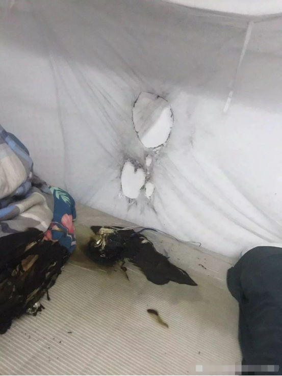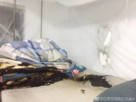 床上的床垫、被子蚊帐等等物品烧成了黑色,触目惊心。爆炸引起的火浇了两桶水才熄灭,看着一阵后怕!